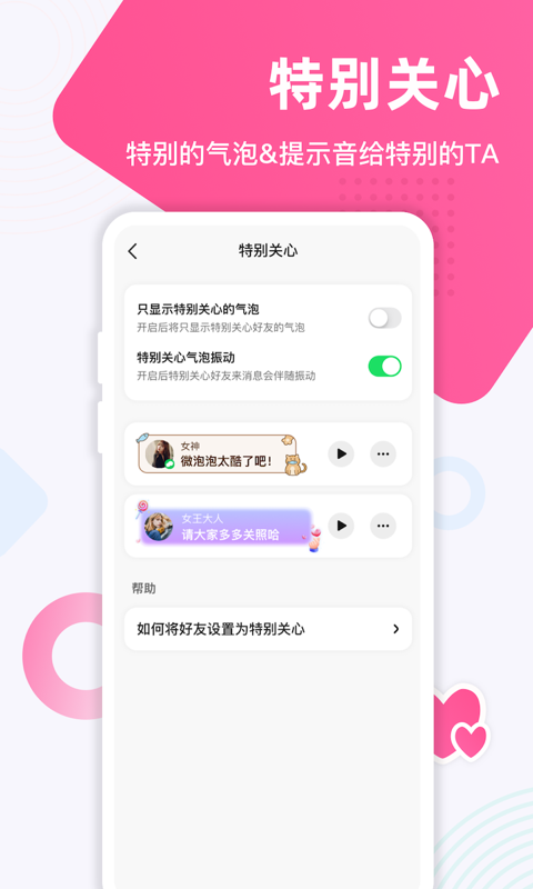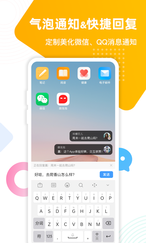 微泡泡是一款备受用户欢迎和好评的高质量系统工具软件,在微泡泡软件里,用户可以获得更多的操作自由,享受软件提供的多种功能体验。同时,非常的好看,操作也是非常的简单,通过软件还可以认识到更多有趣的小伙伴,点击就可以回复,帮助用户快速的回复消息,并且可以进行快捷查看与回复,赶快来手机下载软件体验吧!