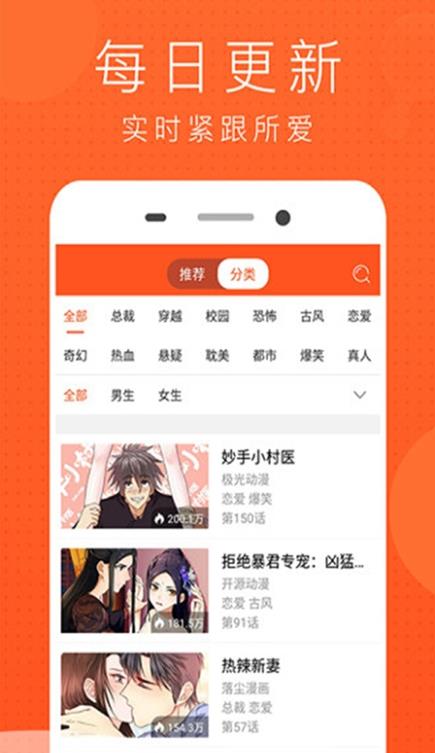 1、丰富的分类:app按照分类标准进行漫画划分,为广大的用户提供了更为细致完善的筛选和浏览方式,如爱情、言情、恐怖悬疑、玄幻、热血等等。