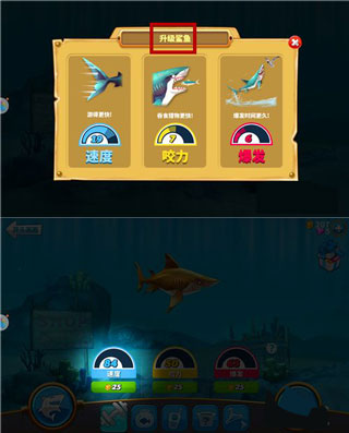 4、升级鲨鱼,相当于升级它的能力,升级需要里面的金币,金币可以通过吃吃吃获得。