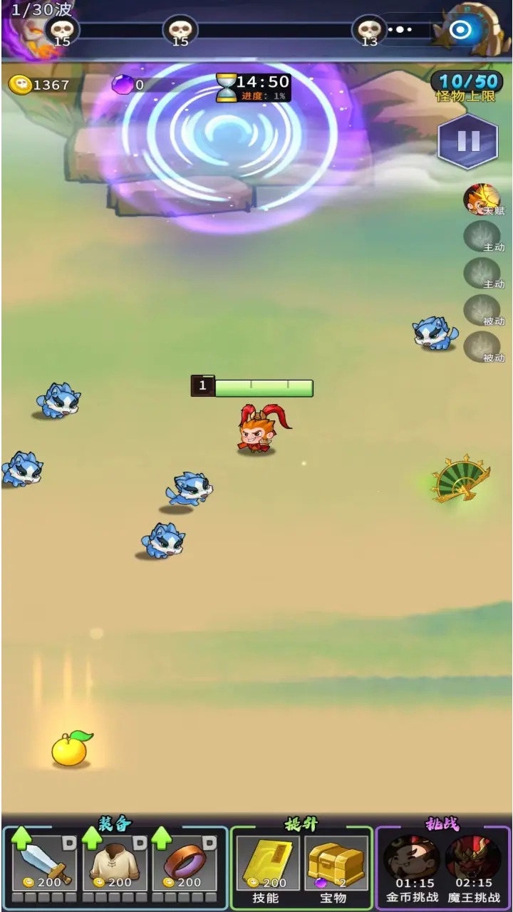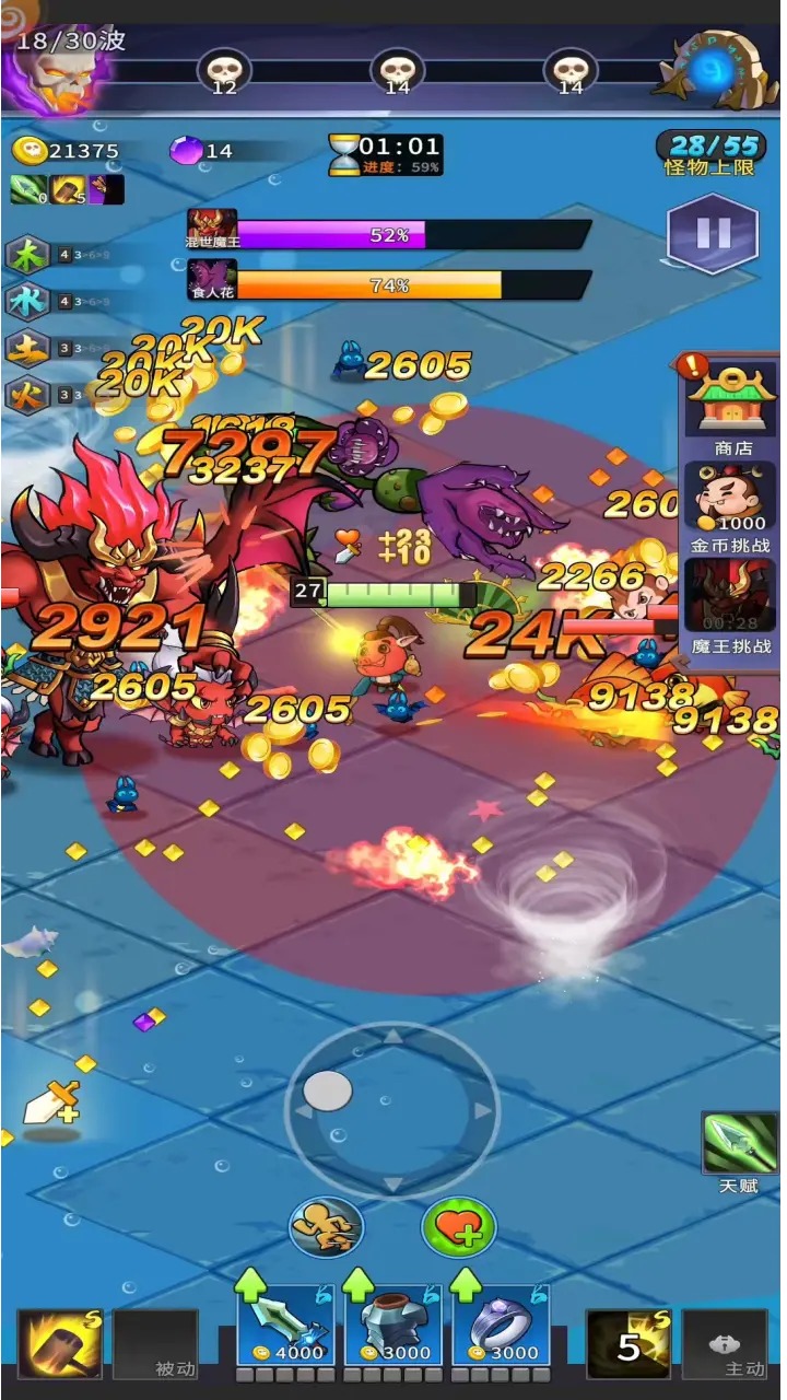 1. 割草战斗:玩家需要在限定时间内,通过滑动屏幕控制角色移动和攻击,消灭不断出现的敌人。