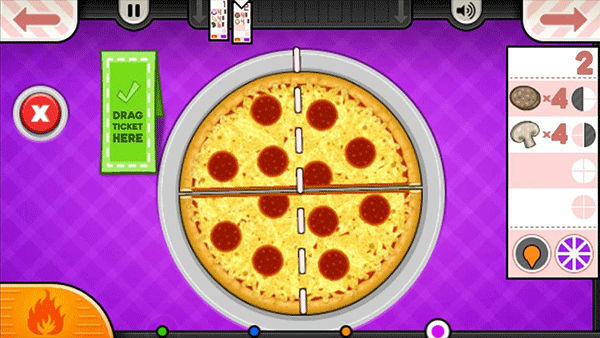 在Papa's Pizzeria,顾客会订购切成四块、六块或八块的披萨。要切片比萨饼,玩家必须在比萨饼上拖动鼠标(或滑动手指)以确定比萨饼切片机在比萨饼上的路径。如果切的片数不正确,或者片大片小,则在将披萨呈现给顾客时将被扣分。