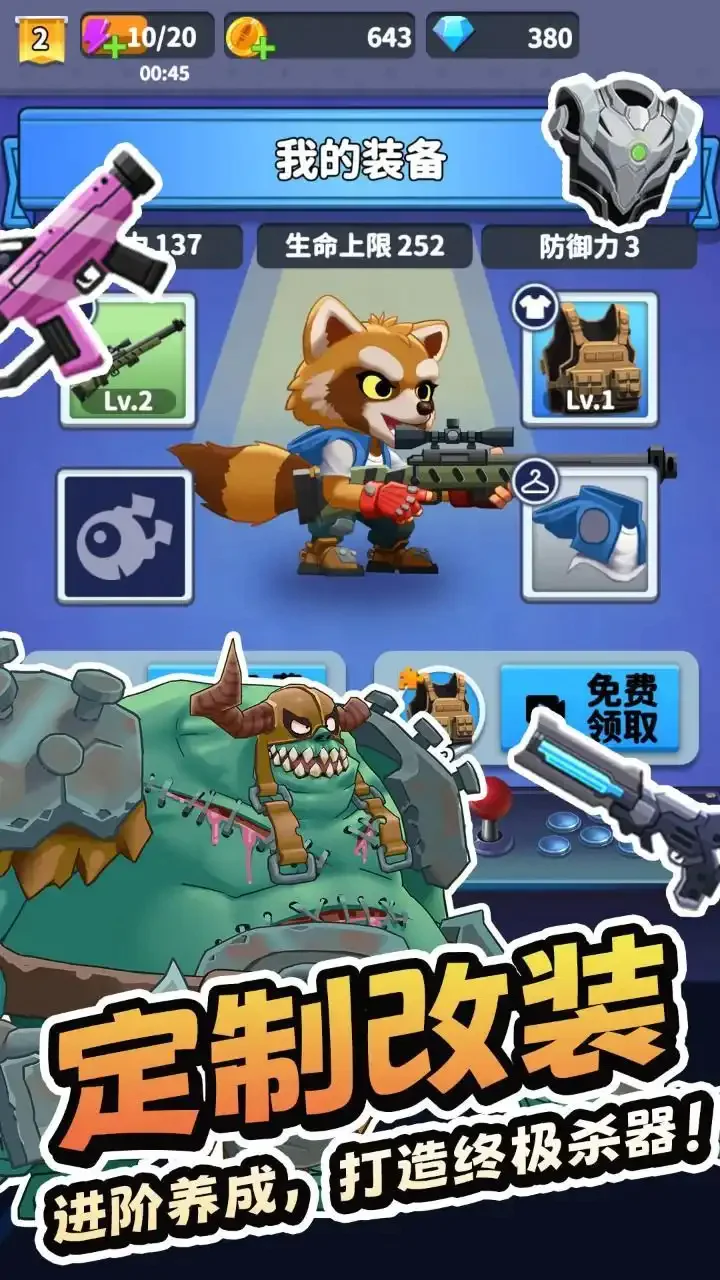 2、提供多样化的武器选择,如加特林、鱼骨头喷射器等,每种武器的攻击力强大,击败怪物后会掉落金币等资源。