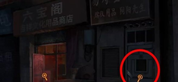 从六宝阁门口右侧的盒子里拿到【剪刀】,界面往左移到月老雕像旁边红线拴住的婚庆店大门,用剪刀剪开红线。即可开启婚庆店的门。