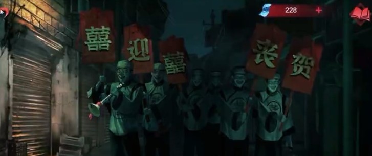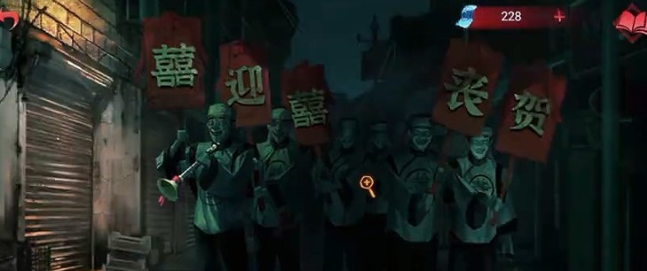 拿到红盖头后,离开婚庆店,界面往左移动,查看迎亲队伍举着的牌子,得到【囍、迎、囍、丧、贺】的顺序,告诉申墨卿。