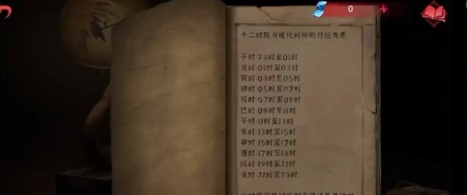 进入【六宝阁】,右侧桌子上有本书(之前放着彩珠盒子的桌子),打开书得知戌时为【19时至21时】。则之前从王娇彤那里得到的【戌时三刻】正确时间为【19时45分】。