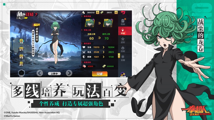 《一拳超人正义执行》是由动画制作委员会全程监修,并正版授权的3D策略卡牌回合制手游。游戏不光画面精美细节丰富,而且在这里,玩家可以召集各路英雄一同抵御怪人入侵。同时还可以多线养成你的英雄们,配合效果多样的源核系统让他们焕发出最强战力!独创的S技能还可以帮你在千变万化的战场中逆转乾坤!一起来体验前所未有的新鲜玩法吧~