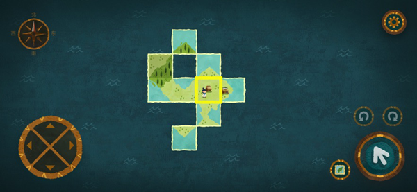 6、要移动某个地图板块,玩家需要先选中该板块,使其被黄色边框包围,然后点击箭头进行选定。接着,使用屏幕左侧的轮盘来移动地图,完成摆放后,点击地图按钮即可进入地图中继续探索。