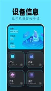 1、轻松获取设备信息,包括设备型号、CPU信息、运行内存、存储空间、屏幕信息、网络连接信息、电池信息等;