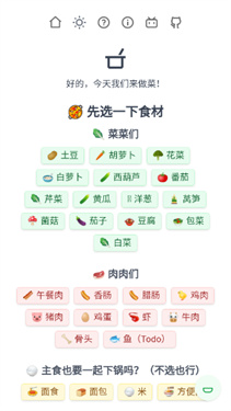 1、下载进入隔离食用手册App,首先需要根据自己拥有的食材和厨具选择相应的关键字;