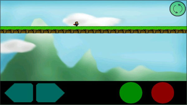 2、使用左边两个按钮控制角色左右移动,点击绿色按钮进行跳跃、红色按钮进行发射子弹。