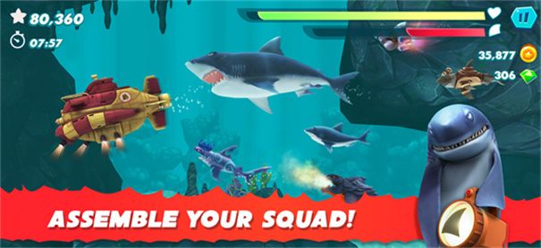 2、道具众多,玩家可以用激光、喷气背包和礼帽等道具装备鲨鱼,提升鲨鱼的实力,