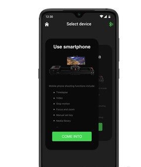 设备 Nano 主界面有“首页”图标,点击可直接回到 app 主界面;“蓝牙”按钮,可快速弹出蓝牙列表显示当前连接了设备或者可以断开当前设备连接同系列其他设备。在该主界面用户可根据自己的需求左右滑动选择进入到手机拍摄或者相机拍摄,不同的选择会有不同的控制界面。