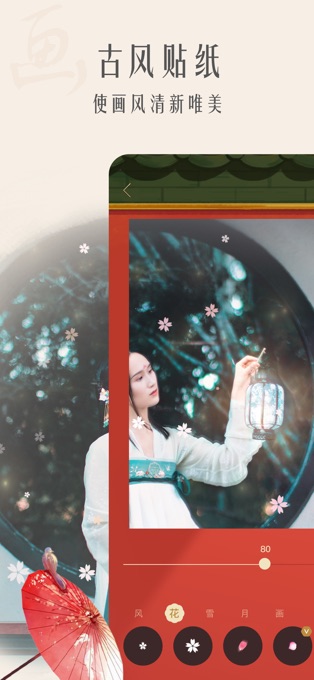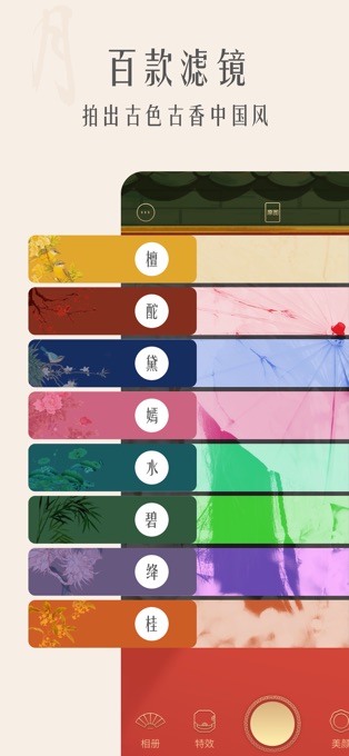 帮助你拍摄出各种各样的中国风的照片,还有不同的相片贴纸可以让你的照片更有味道!