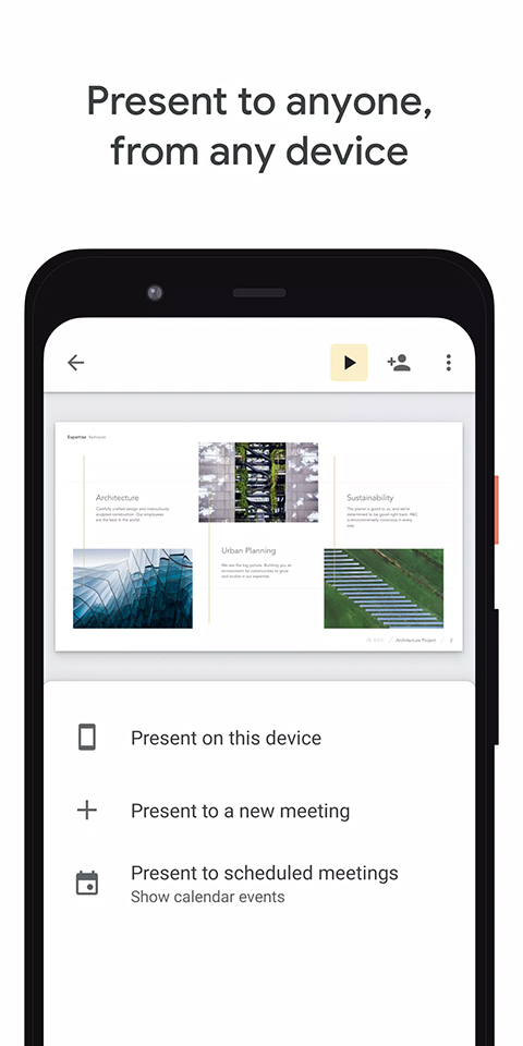 谷歌ppt手机版是一款谷歌集团研发的移动端办公office软件,又叫做谷歌幻灯片,在手机上可以创建演示文稿,制作各种幻灯片,汇聚了所有的实用高效办公特性,让你可以轻轻松松制作出令人印象深刻的文稿,支持多人同时写作,实现远程的信息共享,喜欢谷歌ppt手机版的朋友一起来下载使用吧!