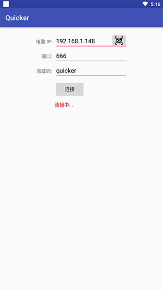 1、连接时,点击Quicker面板顶端的二维码图标,显示扫码连接窗口: