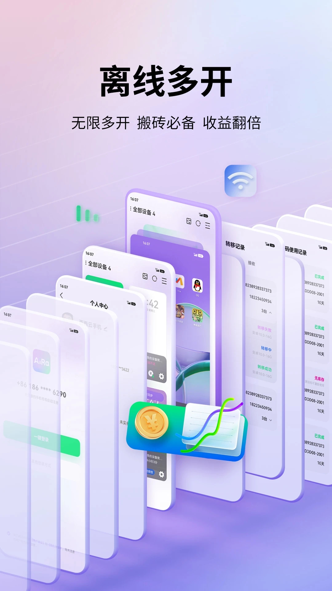 艾拉云手机app是一款好用的云手机软件,支持游戏24小时云端游戏挂机不掉线,还支持游戏和应用无限多开。艾拉云手机app的新用户注册都可以免费领取体验时长,搞定娱乐、办公多种需求,感兴趣的朋友们快来下载艾拉云手机app吧!