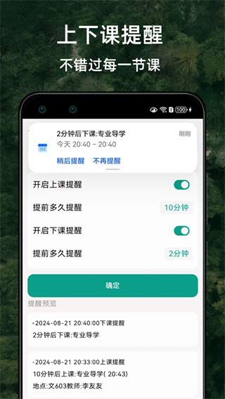 3、课程提醒:提前20分钟闹钟提醒,避免缺课迟到尴尬。