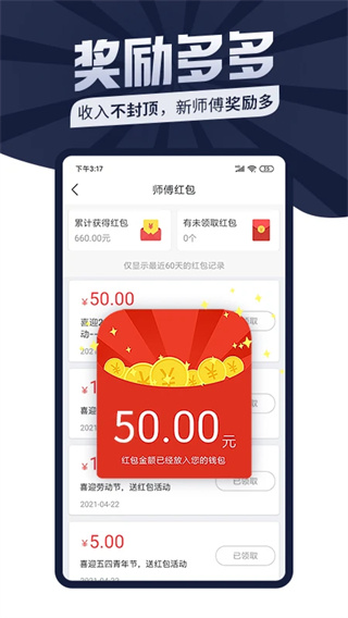 不定期现金红包直接领,接单奖励活动时时有,积分商城更有博世批头套装、手电钻等好礼兑换。