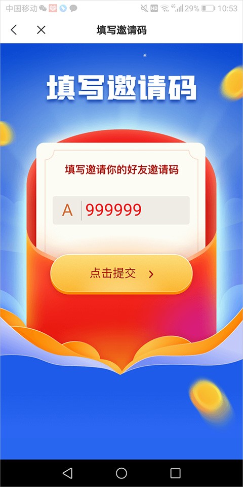 4、前往我的页面,通过集福卡获得金币,并可邀请好友也可获得金币,邀请方式可以通过我的页面中点击【填写邀请码】的方式进行邀请。