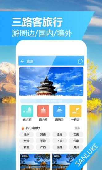 三路客旅行app是一款让旅游更加便捷的旅游app,使用三路客旅行app,你就能定制你的私人旅行,无需受到旅游团的限制,让你能够更加尽兴的旅游,觉得这款软件还不错的朋友快来下载吧!