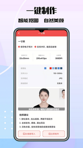 1、根据您需要的规格自动裁剪,算法确保人像的正确位置及比例,底色随意选,更有多种高级底色,让您的证件照与众不同。