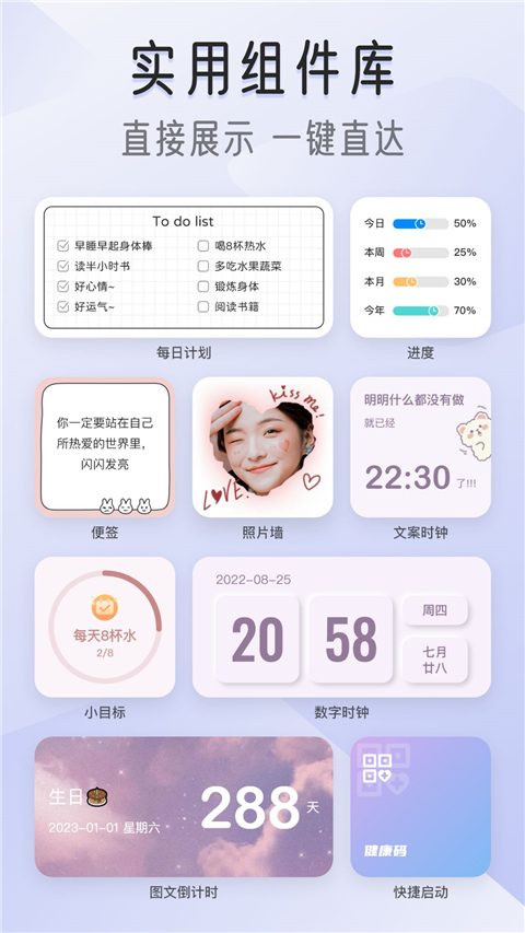 1、操作简单,几秒钟内即可设置并运行小部件 2、数量不限,尺寸多样,满足各种创意 3、组件丰富,提供照片、时间等组件模板