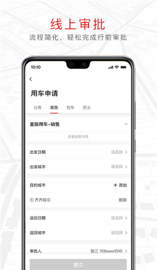 1、智能出行管理,帮助企业实现统一化、智能化和数据化的出行管理。通过企业后台对不同部门、职级、人员的审批流设置进行标准管控,高效管理员工不同场景出行计划,有效规范用车制度,优化流程管理,节约出行成本。