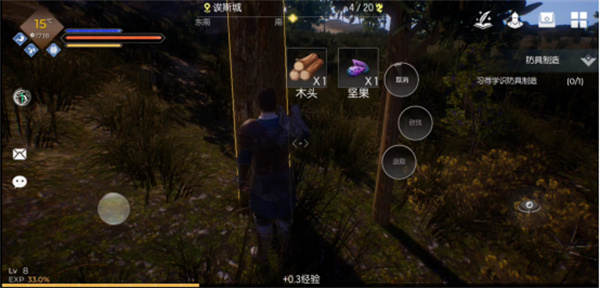 以眼前的杉树为例,选择捡取后,读条速度较慢,收集到的也只有少量的坚果和木材