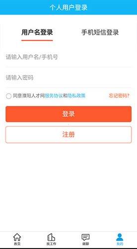 1、下载并打开app,点击右下角【我的】即可登录注册账户(求职者选择个人注册登录,招聘者选择企业登录注册)。